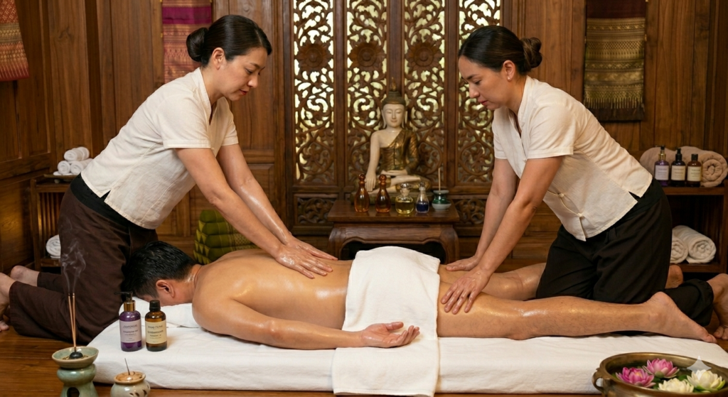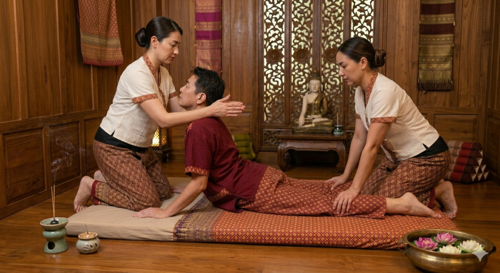 タイ古式の伝統技法を、2名のセラピストが阿吽の呼吸で織りなす「二人ヨガ」の完成形。 4本の手が正確にエネルギーライン(セン)を捉え、1名での施術では成し得なかったダイナミックなアプローチを実現します。重厚な指圧とリズミカルなストレッチのハーモニーにより、心身が根底から解き放たれる感覚をぜひご体感ください。